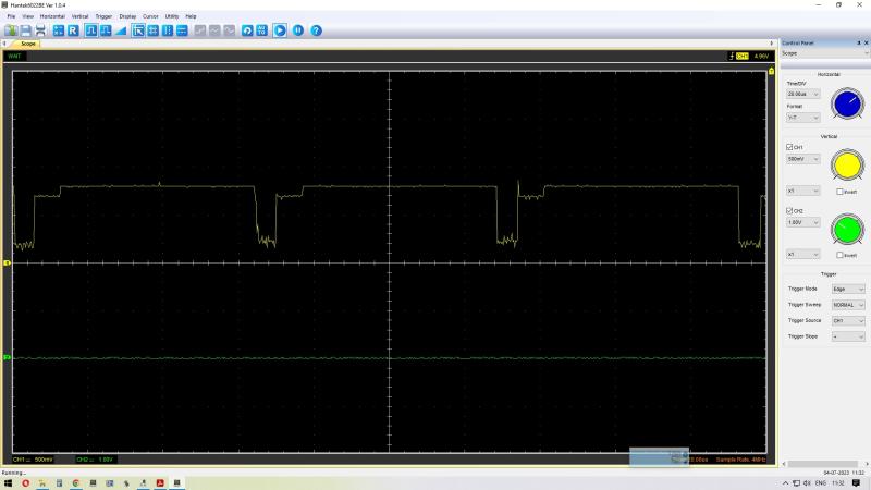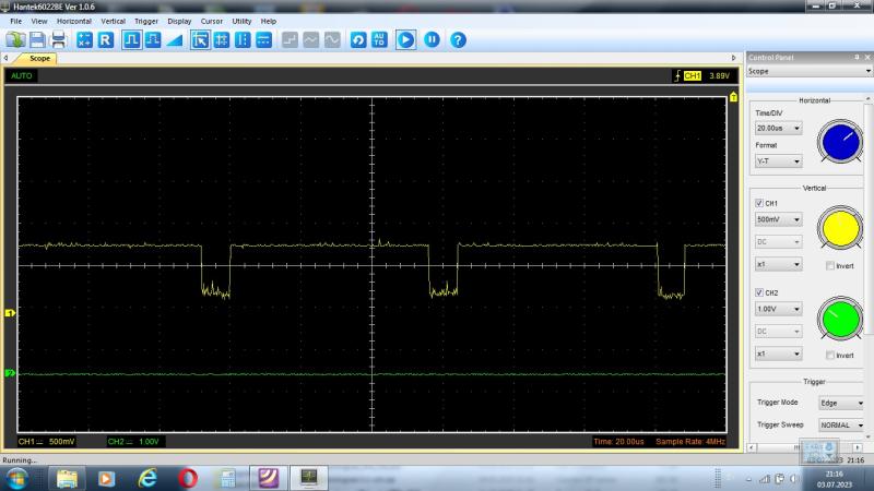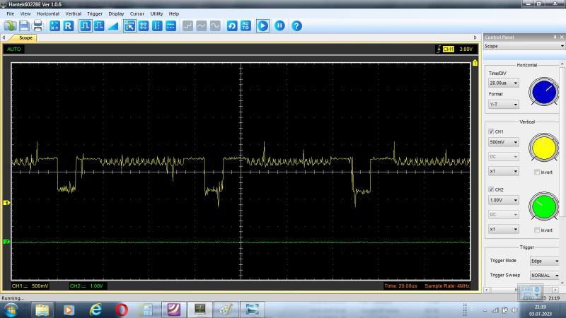 Начал ковыряться с формированием сигнала яркости и обнаружил отсутствие сигнала на 13 DD32, при наличии импульсов на 5 DD32,при этом, сигнал border на 10 DD32 и DD31 с маленькой амплитудой. Заменил DD5 555ЛИ1 на 1533ЛИ1,для увеличения нагрузочной способности. Border стал нормальным, но ни чего на поменялось. Заменил DD32 (555КП13) на проверенную на IC тестере (даже панельку поставил), ... тишина. Думал гасит выход DD34, но при перекоммутации другими сигналами все проходит. Отрезав вход 5 DD32 на выходе 13 появляется сигнал схожый с border, который уже нормально проходит через DD34, а на экране появляется яркая зона PAPER.