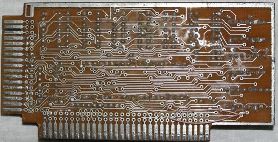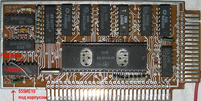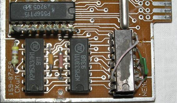 - напаянная "вторым этажом" над счетчиком 555ИЕ10 неизвестная микруха со стертой маркировкой. От нее - провода на счетчик и на ВГ93 (см. фото оборота платы) - м/с удалось идентифицировать - это 555КП11 для "турбирования" ВГ93 (чтение - при 2МГц, запись - при 1МГц) там же на плате видна перерезаная в процессе "турбирования" дорожка от 13-й ноги ИЕ10