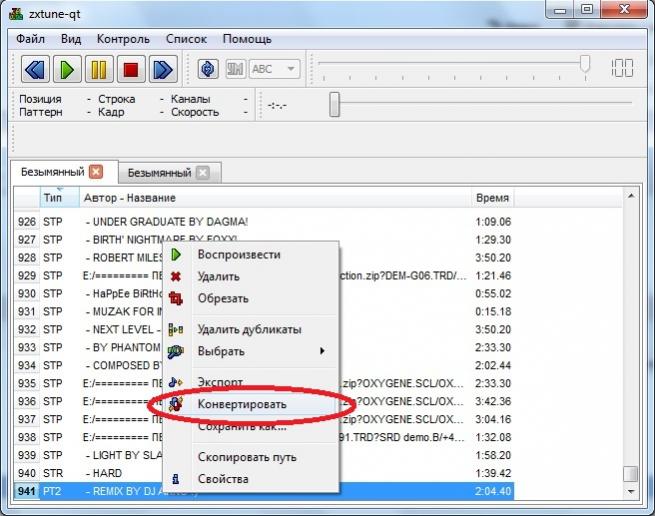 Gavrilov_S, запусти ZXTune на компьютере, выбери нужную мелодию, щелкни правой кнопкой мыши на этом треке и выбери в появившемся меню "Конвертировать" (смотри картинку). Далее выбери какой формат (WAV, MP3 и т.д.) и битрейт, а также куда сохранять. Вот и всё. Кстати бульбовский эмуль не все форматы воспроизводит, потому настоятельно рекомендую именно ZXTune-Qt (ссылка в пером посте темы)