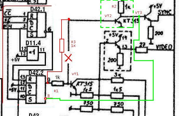 2. Remove R2, VT2, and add wire between D42.8 and VT3.base (in green)