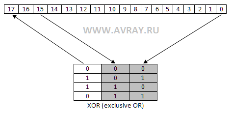 UPD: оказалось это не совсем корректно, по последним данным нужно двигать значение генератора на 1 бит вправо, затем, если вытолкнутый бит равен единице, то сигнал шума становится равен единице (иначе нулю) а значение генератора ксорится с 0x14000