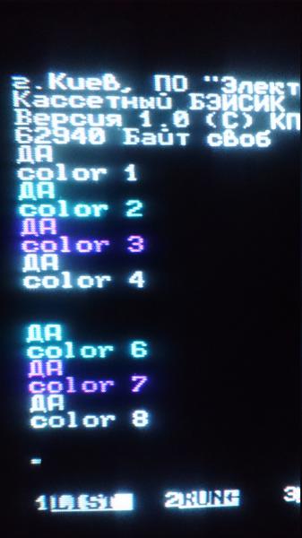В Бейсике в текстовом режиме я вижу только 4 цвета, хотя на стандартной CGA-карте видел бы 8 даже без этого контакта. Дальше увеличивая номер цвета в команде COLOR цвета просто зациклены.