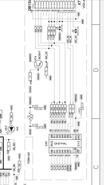 Сорри, нечем повернуть фрагмент (с телефона пишу), здесь точно так же все, тоже r-2r (приблизительно), но это все на ls245 и там явно будут только нули и единицы, никакого Z на яркостных выходах быть не может, как в нашей плате. И питание 5-вольтовое (уровень в 1 другой). Еще отличие - все выходы нагружены на 100-омные резисторы, это может давать существенную разницу. И у Эвы питание для видео отдельно формируется/сглаживается, это тоже важно.
