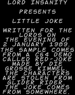 А демы LORD делал сам. В деме CRAZY SAMPLE 2 написано, что музон написан в трекере под названием LORD INSANTINI. А в деме INSIGHT VIEW LORD написал,что музыку конвертировал некто INSANITY !!! В другой деме LORDA написано, что некто SCRUNK (лучший кодер) через LI (LORD INSANITI) c C64 конвертировал музоны. Скорей всего конвертировал SCRUNK , а редактировал (доводил до ума) сам LORD.