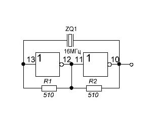 Схема генератора самая простая, задействованы не используемые элементы ЛН1. В случае запуска альтернативного генератора, резисторы на ножках 13 и 11 впаиваются вертикально (если смотреть на разводку) и припаивается перемычка. Для этой реализации убрал резисторную сборку и поставил отдельные резисторы.