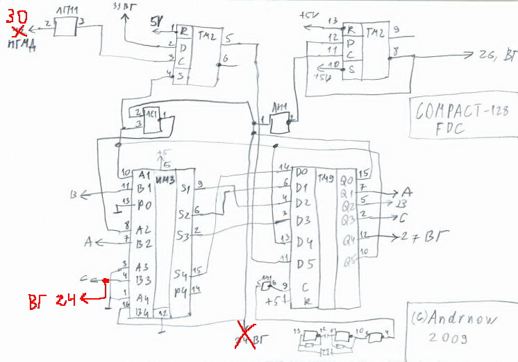 Вчера я поменял транзистор,честно говоря он был исправен.При всём уважении Andrnow я с вами не соглашусь! Я отпаял ВГ93 и с помощью мультиметра выяснил что сигнал на транзистор приходит через резистор с 24 ноги (CLK) ВГ93,а сюда он приходит со 2 ноги D62 (ТМ9) и 4 ноги D63 (ИМ3). Этих микросхем нет на принципиальной схеме,по ходу они относятся к ФАПЧ которой нет на схеме (кроме прямоугольника с соответствующей надписью).Может всё таки есть ПОЛНАЯ схема Compact'a?? Кстати,обратил внимание что ТМ9 греется что для 555 серии не свойственно если я не ошибаюсь?Также мне не понятно с какой целью перепаяны по другому ножки D51 (ТМ2).