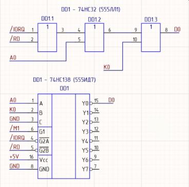 Предлагаю проверить целостность резистора R16 (его выводы должны прозваниваться с цепями K1 (вывод 1 ХМ1) и +5В (вывод, вроде, 64 ХМ1)), и во включенном состоянии компьютера между K1 и GND должно присутствовать напряжение +5В. Если с резистором R16 все нормально, тогда попытаться подпаяться к цепи K1 маломощным диодом (анодом на K1) и катод этого диода кратковременно подключать к цепям А8-А15 Z80 (выводы 38-40, 1-5). Если реакции не будет, значит имеет место самый плохой вариант - повреждена ХМ1 и тогда придется лепить внешний костыль, сделать однобитный порт клавиатуры #FE. По первому, на ЛЛ1, или второму, на ИД7, варианту схемы, какой удобнее. Ну или сообразить, подобный элемент 4ИЛИ на том, что найдется под рукой. В данном случае сигналы /IORQ и /RD формируют сигнал чтения из портов ввода-вывода, A0 формирует признак чтения из портов кратных /FE, K0 сигнал сканирования столбцов D0 портов клавиатуры, D0 шина данных процессора. Все сигналы, за исключением K0 берутся с соответствующих ножек Z80.
