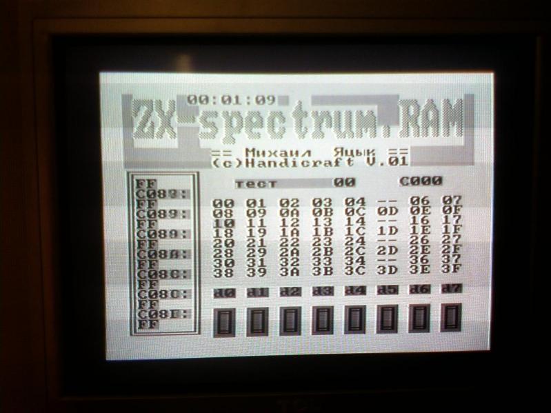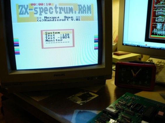 На фотках: "Шахматка" (ОЗУ установлено, процессор и ПЗУ - нет); "Матрац" (ОЗУ и процессор установлены, ПЗУ - нет); Тест (ОЗУ, поцессор, ПЗУ установлены).