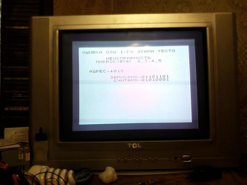 Запустил тестПЗУ с двухкилобайтным тестом, заполнение области экрана 00 и FF проходит нормально, без мусора. Буфер чтения исправен, а вот потом ошибка 1-го этапа теста! пишет неисправность микросхемы с номерами такими-то, по адресу 4000 и выше. причем адрес постоянно меняется, но не меньше 4000.