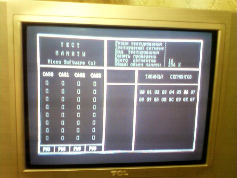 Фото 3 : тест памяти. причем интересно - тест нашел 16 сегментов и 256кб памяти, а слева показывает 32 микросхемы, по 8 штук на каждый CAS... обычно, тест показывает реальное кол-во микросхем.