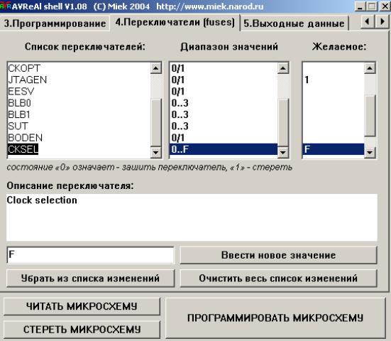 Для этого в четвертом окошке AVRShell ("Переключатели") щелкаем по параметру CKSEL, на два окошка ниже вводим букафку "F" и жмем кнопочку "Ввести новое значение". После этого экран примет примерно такой вид, как на приведенном скрине. Кстати, на скрине видна также "1" в поле JTAGEN. Лично мне это было нужно, вам навряд ли понадобится.