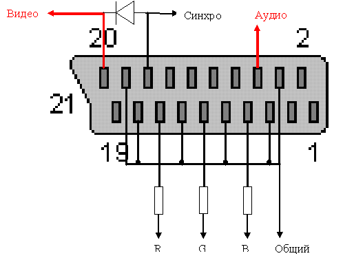 Вот мой шнур RCA-RGB-SCART. У меня им к телеку подключен сразу и Спек по RGB и Сега по композиту. На схеме вид на сам разъем SCART изнутри (т.е. там, где будешь подпаиваться). Красным цветом выделены провода (видео и аудио), которые изначально присутствуют на стандартном шнуре 2RCA-SCART. Если композитный вход не нужен, то диод можно выкинуть, а выводы SCARTa куда он подключен соединить вместе. Диод вроде бы надо ставить германиевый, однако я всунул первый попавшийся под руку КД521, и все нормально пашет. Резисторы могут быть от 100 до 500 Ом (у меня 330), их номинал зависит от конкретного телевизора и конкретного Спека (может быть ситуация, что из-за слишком больших сигналов телек будет неправильно отображать цвета).