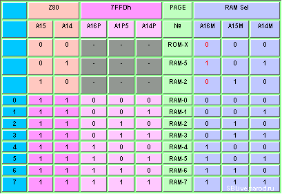 Одним словом вместо 0 банки находится ROM, вместо 1 - 5, 2 банка находится на своем законном месте, ну а сама 0 банка находится в #С000-#FFFF, по простой причине - порт оверлея по сбросу обнуляется и биты D0-D2 становятся 000%.