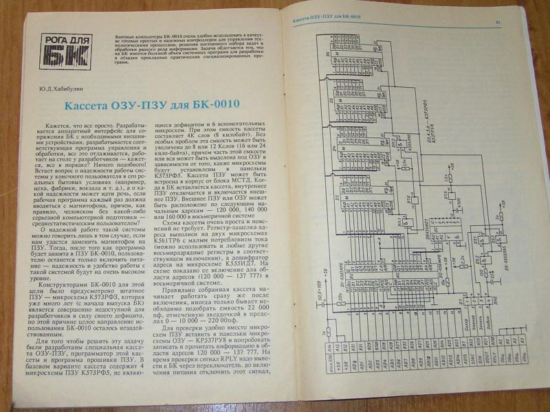 Недавно разбирал 20-ти летние завалы в гараже и наткнулся на громадный ящик с всякими журналами типа Радио, Вычислительная техника и пр. В основном все конца 80-х начала 90-х. Бегло пролистал и на глаза попалась статья "Кассета ОЗУ-ПЗУ" для БК0010. Как я понял эта кассета может быть заменой РФ3 которую нигде не найти либо как доп.ОЗУ.
