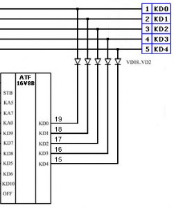 AndyP, нужно либо изменить подключение выходов ATF к шине данных, либо изменить ее прошивку для данного подключения. Выходы должны быть подключены: 19 вывод через диод к шине KD0, 18 – KD1, 17 – KD2, 16 – KD3, 15 – KD4.