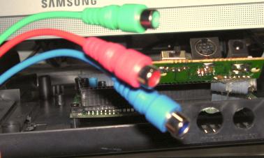 На фоте: синий провод это правый канал, красный левый канал, вдали зеленый, это видео. Вообщем вот...