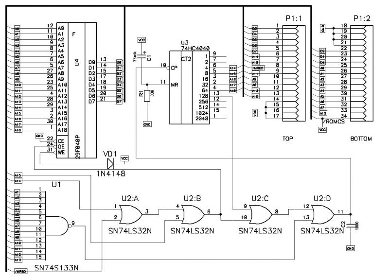 Вторая схема - я не помню где я ее скачивал, но - примерно тоже самое, те же сигналы, но ПЗУ уже меньшим объемом. Качество, конечно, ужасное... Но все-равно можно разобраться.