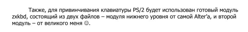 Модуль клавиатуры взят от проекта Орион от Igor_t, общался с ним когда-то давно, когда только начинал ковырять ПЛИСы. И перепахан этот код до состояния частичной узнаваемости, ибо разницы там ну очень много.