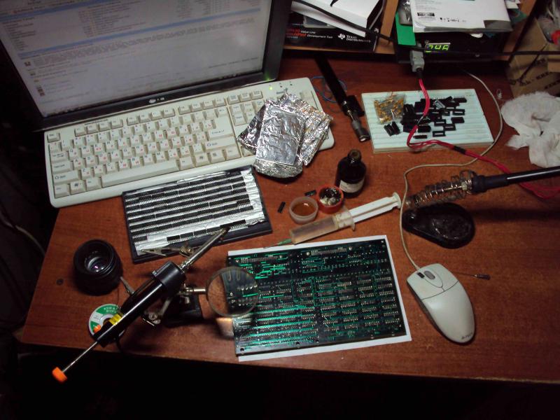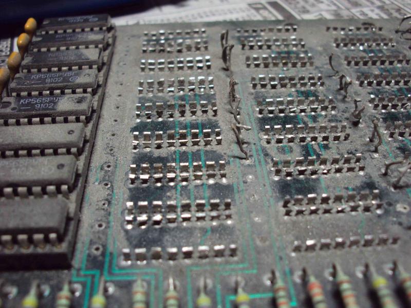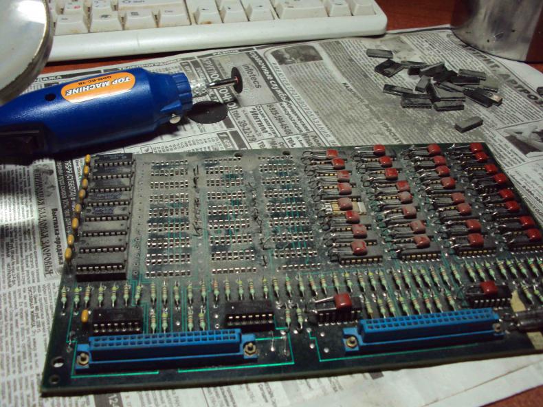 ужас какой! Пыль и грязь, да еще и абразивная. Качественные бокорезы замечательно выгрызают микросхемы в DIP корпусах. Одну сторону откусываем, вторую отламываем у корпуса микросхемы парой качков. Далее плату в поворотные тиски. Для ремонта ТЭЗов в комплекте больших компутеров были удобные держатели в регулировкой поворота и наклона, но и с тисками сносно. Греем паяльником вывод и выдергиваем пинцетом. При соответствующей сноровке можно успеть прочистить отверстие зубочисткой. Раньше приходилось затачивать спичку, но там дерево мягкое, хватает не на долго. Стальной иголкой намного хуже. После промываем спиртом и мазюкаем флюсом. Можно впаивать новые микросхемы. ПМСМ оловоотсос фигня, подвергает плату довольно значительным ударным нагрузкам. Во всяком случае обычный пружинный. Может кварцы поломать или еще каких скрытых дефектов добавить.