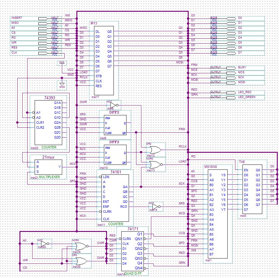 Ewgeny7, попробуй вот эту версию с SD интерфейсом. Что-то не очень то работает. На SD карту нужно записать Монитор 4 кБайта (файл BIOS.bin). Может глаз не замыленный найдёт ошибки. Повторяю что в начале при np=1 ПЗУ сидит 0000-7FFF, потом ОЗУ 8000-EFFF, SPI F000-F7FF (вернее первые два адреса всего юзаются), и наконец порты клавиатуры F800-FFFF. Затем после инициализации порта РУС (np=0) ОЗУ становится 0000-EFFF и BIOS.bin грузится с адреса С000. Управление передается в С000.