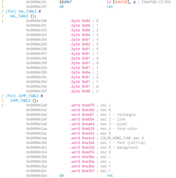 Не совсем понял. Вот расковырянный ROM, в нем две таблицы, относящиеся к ESC-последовательностям. Значения в первой таблице как бы намекают на количество параметров.