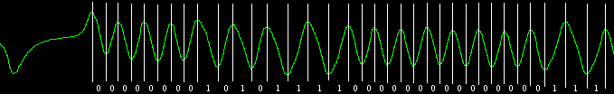 Измеряем время (количество сэмплов) от минимума до максимума, если меньше 9 (при 44100Гц) то ноль, больше - еденица. Далее от текущего максимума до следующего минимума, и т.д. Короче, расстояние между соседними минимумом и максимумом определяет значение бита.