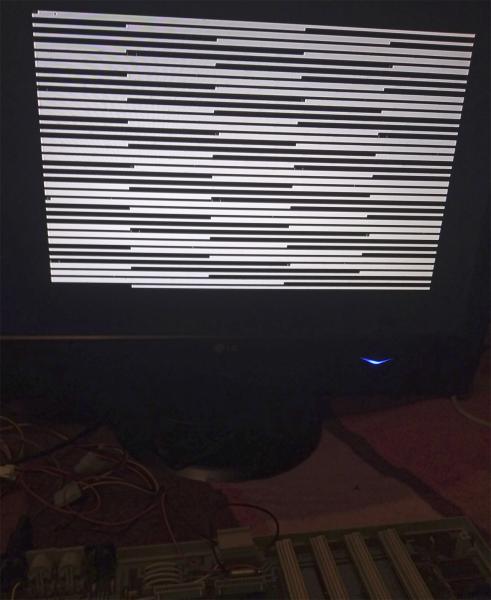 На экране белая "кракозябра-матрица" (но есть ощущение что сбита синхра и все видео-куски на экране одинаковы, и где-то в этих дебрях однообразно мигает курсор- видно в одних и тех же местах черточку мигающую). Может выход взял не тот?