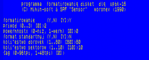 - программа форматирования дискет FDZ.SAV. Может размечать дискеты в произвольном формате (дорожки и сектора возможно указывать вручную). При запуске перекрашивает экран в синий цвет.