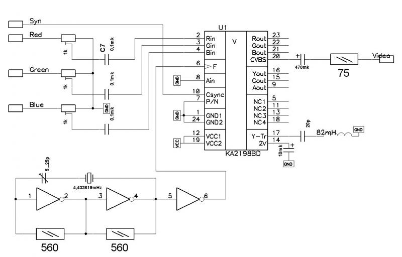 Вообще, вся эта схема есть в даташите на KA2198BD. Я лишь добавил подстроечники и генератор. Все остальное - не используется.