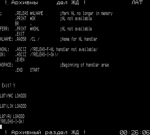 поправил в такой вид, часики подгружает и на выходе выгружает,Код:.TITLE RELEAS .MCALL .FETCH,.RELEAS,.EXIT,.PRINT START: MOV @#50,R1 ADD #2, R1 .FETCH R1,#NLNAME ;Load NL handler BCS FERR ;Not available ; Use handler ; .RELEAS #NLNAME ;Mark NL no longer in memory .PRINT #OK ;NL not available BR . FERR: .PRINT #NONL ;NL not available .EXIT NLNAME: .RAD50 /CL / ;Name for NL handler NONL: .ASCIZ /?RELEAS-F-NL handler not available/ OK: .ASCIZ /?RELEAS-I-Ok!/ .EVEN HSPACE: ;Beginning of handler area .END START