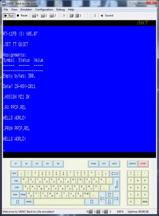 Код:.TITLE PPCP .IDENT /V01.00/ $USRSP == 42 ;USER STACK POINTER CR = 15 ;CARRIAGE RETURN LF = 12 ;LINE FEED .MCALL .EXIT,.TTYOUT ;SYSTEM MACRO CALLS START:: CMP @#$USRSP,SP ;RUNNING UNDER RT-11? BEQ 10$ ;EQ->YES MOV #PR.PP,PRINT ;UPDATE PRINT HANDLER MOV #EX.PP,EXIT ;UPDATE EXIT HANDLER 10$: MOV #TEXT,R1 ;POINT TO ASCIZ STRING CALL @PRINT ;PRINT IT JMP @EXIT ;EXIT PR.PP:: MOV R1,10$ ;SET STRING ADDRESS JSR R4,@#163006 ;PRINT STRING 10$: .BLKW ; RETURN ;RETURN PR.RT:: MOVB (R1)+,R0 ;GET CHAR BEQ 10$ ;EQ -> END OF LINE .TTYOUT ;PRINT CHARACTER BR PR.RT ;LOOP 10$: RETURN ;RETURN EX.RT:: .EXIT ;EXIT TO OS EX.PP:: MOV #START,R1 ;FREE MEMORY AND EXIT JMP @#176300 ; PRINT:: .WORD PR.RT ;RT-11 BY DEFAULT EXIT:: .WORD EX.RT ; TEXT: .ASCIZ <CR><LF>/HELLO WORLD!/<CR><LF> .END START