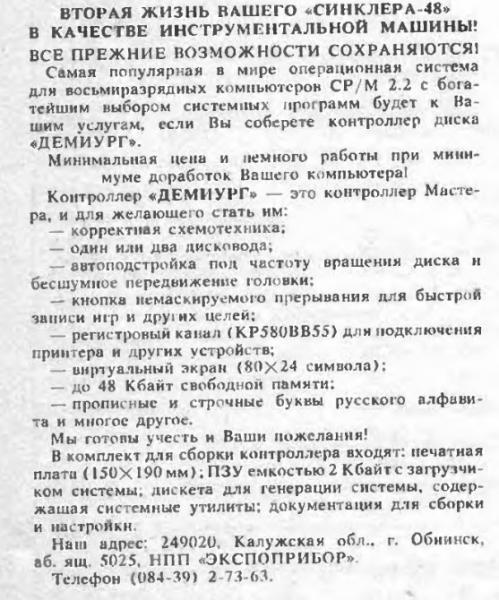В рекламном блоке журнала "Радио", №7, 1992, стр. 64, было опубликовано объявление от обнинского НПП "Экспоприбор" о разработанном ими контроллере диска "Демиург" для 48К-совместимых машин. Насколько я понял, это была некая переделка ТРДОСа, с дополнительным ВВ55, а также с загрузочным ПЗУ в 2К, обеспечивающего до 48К свободной памяти для СР/М, виртуальный экран 80х24, прописные и строчные буквы кириллицы и иные ништяки с плюшками.