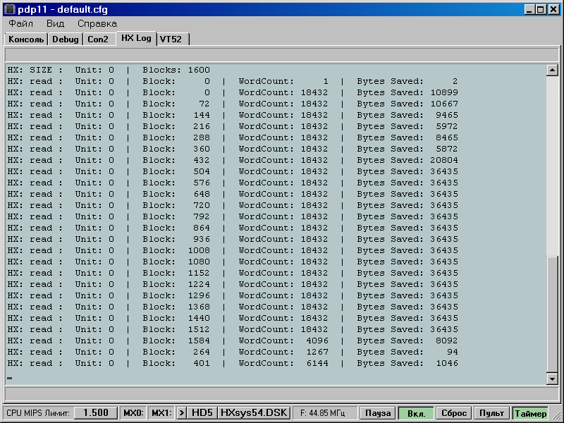 А УКНЦ при включенном сжатии не работает. Загрузил систему без сжатия, потом включил его. Чуть-чуть прочиталось и на этом все остановилось. При этом даже не работает перезапуск с адреса 0, вываливается в пультовый отладчик с сообщением о невозможности прочесть систему. После отключения сжатия перезапуск по нулевому адресу прошел нормально.
