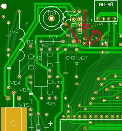 обмотку , которая правее, шелкографией нарисована неверно, надо как красным подправлено. Или пятак под нее поближе к Тр1 подвести дорожкой под R28