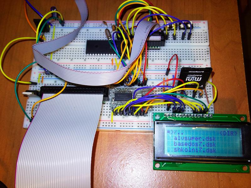 Уперся в проблему, что "дисковод" не хотел читать правильно дорожки после примерно 3 или 4-ой. Сегодня догадался в чем дело - необходим специфический тип переменной для функции сдвига по файлу библиотеки FatFS, которую я использую для доступа к карте памяти. После исправления все заработало. Вот ШКОЛЬНИЦА и загруженная РАПИРА с этого диска. Штатный Бейсик загружается, но почему-то после этого начинает печатать Ъ на экране, как будто залипла клавиша. Похоже Бейсик по другому опрашивает клаву. Буду разбираться с ним, а также тестировать другие образы.