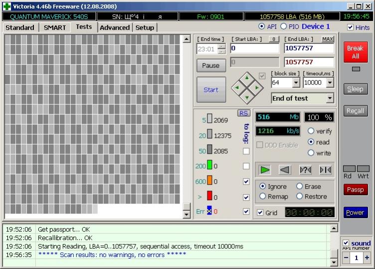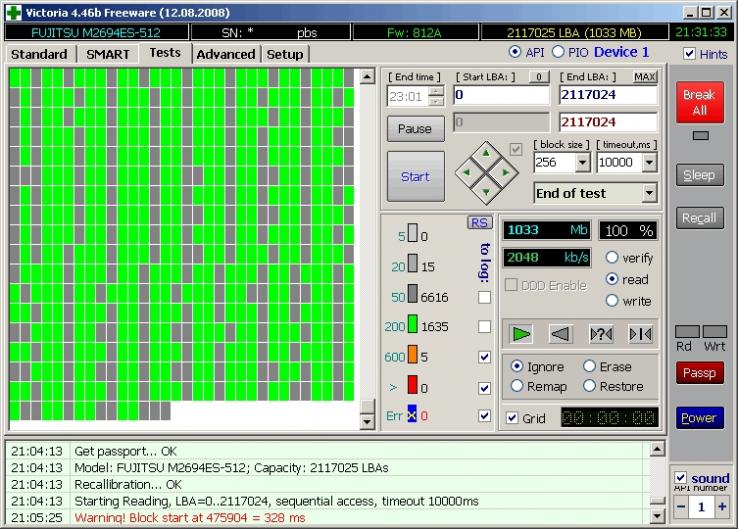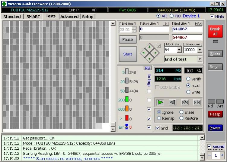 Итак. Есть 3 диска на 314, 516, 1033 Мб. Модели на скриншотах. Бэдов нет, если так можно выразиться (дисков без бэдов не бывает). Смарт посмотреть нельзя по понятным причинам, потому значение критических параметров неизвестно. Факт того, что нечитаемые сектора в ходе скана отсутствуют, говорит о том, что зона ремапа не заполнена, а, следовательно, диски полностью исправны. Сканы сделаны на контроллере Advansys в режиме линейного чтения сразу после 2-х часового рандомного (полного стресса/разогрева). С зеленым скрином все в порядке - это особенность модели, плата за плотность так сказать, режим buttrefly подтверждает. Скорости чтения в начале диска 1,3 / 2,4 / 3 Мб соответственно, в конце - см. скрины. Известна некоторая история по конкретному диску, вместо смарта ;] Про нестыковку с PC заточенных под маки винтов никогда не слышал, винда 95 работала отлично, пользовались адаптеками.