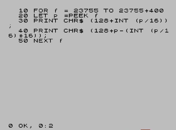 9999 for f = 23755 to (23755 + len): let p = peek f: print chr$(128+p/16); chr$(128+p-(INT(p/16)*16); : next f