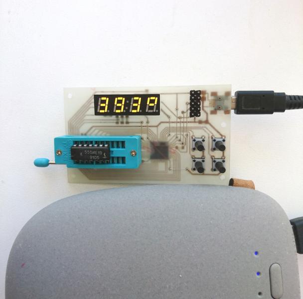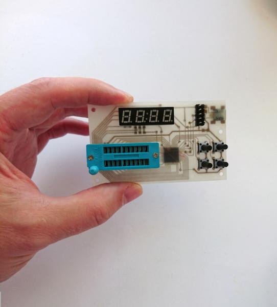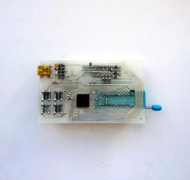 несмотря на то, что у меня уже был тестер от Trol'a, решил собрать и этот приборчик. Atmega8515 у меня была TQFP поэтому пришлось делать плату. Текстолит было лень покупать поэтому размеры пришлось ужимать в имеющиеся в наличии обрезки шириной 50мм. Вся конструкция вышла размером с визитную карточку. Тестер заработал сразу, прошивка 1.30. Кстати, точка на индикаторе все же используется, для индикации версии прошивки. У меня вместо точки горят часовые разделители).