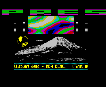 Верхняя бегущая строка полностью на бордюре! плюс динамичный мультиколор над горой И это все на contended memory! Круто...