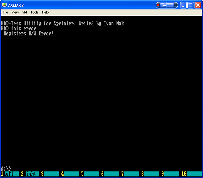 В итоге загрузка с винта не идетКод:Error 07:45:50.056 *** unknown ATA cmd #00 *** в ZXMAK2.LogAgent.Error(String fmt, Object[] args) в ZXMAK2.Hardware.IC.AtaDevice.exec_ata_cmd(Byte cmd) в ZXMAK2.Hardware.IC.AtaDevice.write(Int32 n_reg, Byte data) в ZXMAK2.Hardware.IC.AtaPort.write(Int32 n_reg, Byte data) в ZXMAK2.Hardware.Sprinter.IdeSprinter.WriteIdeCommand(UInt16 addr, Byte value, Boolean& iorqge) в ZXMAK2.Interfaces.BusWriteIoProc.Invoke(UInt16 addr, Byte value, Boolean& iorqge) в ZXMAK2.Engine.BusManager.WRPORT(UInt16 addr, Byte value) в ZXMAK2.Engine.Z80.Z80CPU.ED_OUTCR(Byte cmd) в ZXMAK2.Engine.Z80.Z80CPU.ExecED(Byte cmd) в ZXMAK2.Engine.Z80.Z80CPU.ExecCycle() в ZXMAK2.Engine.BusManager.ExecCycle() в ZXMAK2.Engine.SpectrumConcrete.ExecuteFrame() в ZXMAK2.Engine.VirtualMachine.runThreadProc() в System.Threading.ThreadHelper.ThreadStart_Context(Object state) в System.Threading.ExecutionContext.Run(ExecutionContext executionContext, ContextCallback callback, Object state) в System.Threading.ThreadHelper.ThreadStart()