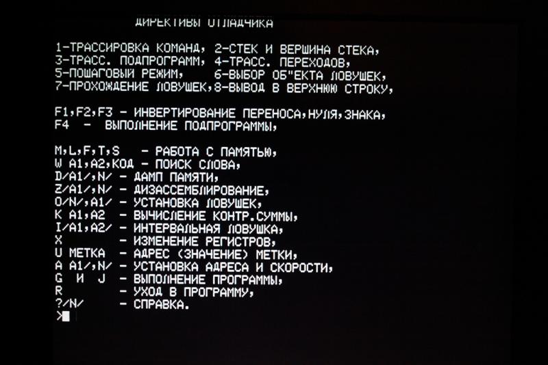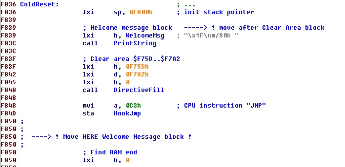 Журнальный вариант Монитора у меня работать напрочь отказался, пришлось прибегнуть к реверсному инжинирингу и пультовой отладке. На удивление, при всей стройности и элегантности кода, я обнаружил довольно грубую ошибку - сразу после сброса и настройки указателя стека идет обращение к функции вывода строки на экран, которая использует ряд переменных, инициализация которых происходит несколько позжеА так как среди этих переменных есть довольно важные, отвечающие за вызов внешних обработчиков, то поведение программы становиться непредсказуемым.
