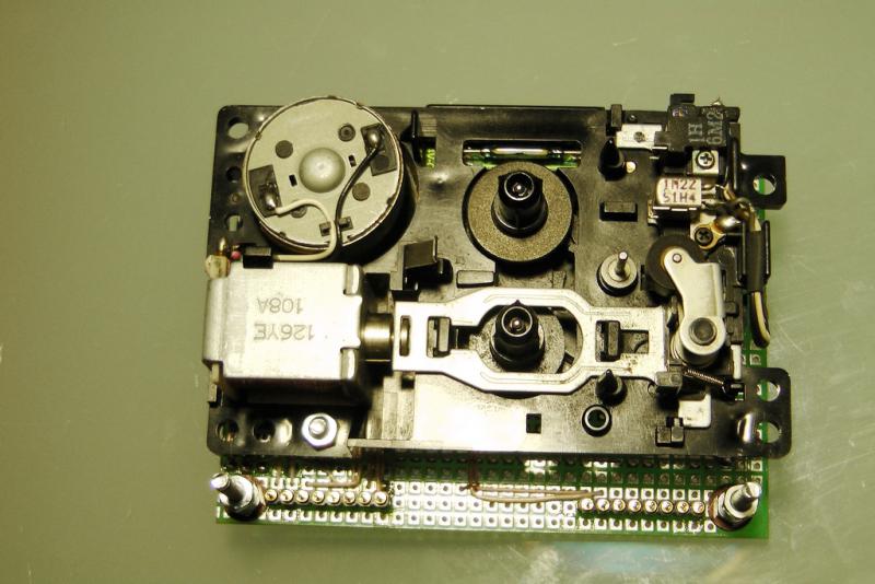 Лентопротяжку использовал от какого-то автоответчика, оказалась как раз подходящая для моих целей - вполне приличный бронзовый маховик тонвала, возможность полного логического управления, датчик для счетчика ленты. И уж совсем невероятное - настоящая стирающая головка, а не постоянный магнит, как принято во многих микрокассетных девайсах.