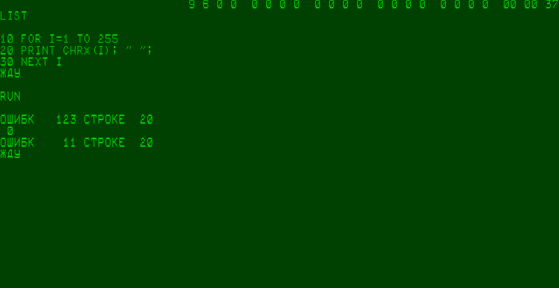 Хотя оператор LET не требуется для определения переменной цикла FOR. Следующее подозрение - что в бейсике ДВК отсутствует встроенная функция CHR$.