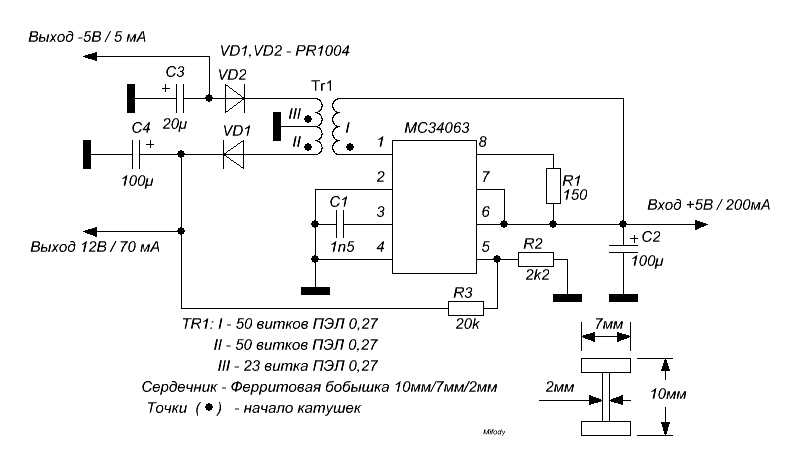 Я где то месяц назад собрал вот такой преобразователь для Вектора-06Ц, так как с блоками питания у меня напряг. За основу взята типовая схема включения МС34063. Можно, конечно, собрать для каждого плеча отдельный преобразователь на этой же микрухе. Но при такой схеме включения экономим немного места и 1 микруху..)))