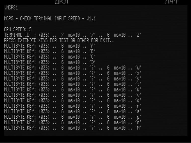 Код:.RU MCPS MCPS - CHECK TERMINAL INPUT SPEED - V1.2 CPU SPEED: 3 TERMINAL ID : <033> [ 20.6 ms ] '/' [ 1.6 ms ] 'Z' AUTOANSWER : <003> [ 18.2 ms ] <003> PRESS EXTENDED KEYS FOR TEST OR OTHER FOR EXIT.. MULTIBYTE KEY: <033> [ 1.6 ms ] 'A' MULTIBYTE KEY: <033> [ 1.6 ms ] 'B' MULTIBYTE KEY: <033> [ 20.8 ms ] '?' [ 1.6 ms ] 'r' MULTIBYTE KEY: <033> [ 1.6 ms ] '?' [ 1.6 ms ] 'M' MULTIBYTE KEY: <033> [ 1.6 ms ] '?' [ 1.6 ms ] 'u' MULTIBYTE KEY: <033> [ 1.6 ms ] '?' [ 1.6 ms ] 't' PROGRAM COMPLETED