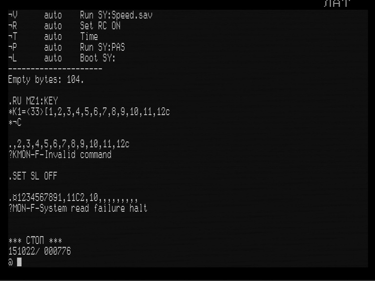 Далее выключаем SL командой SET SL OFF и после нажмем К1. Видим довольной ужасный результат. Еще можно заметить, что под курсором находится еще запятая. А далее самое интересное - жмем <Enter> и получаем страшное сообщение о невозможности считать систему. Таким образом сказался эффект реверсивного буфера, данные заносятся не только в сам буфер, но и за его пределы, портя код RMON.