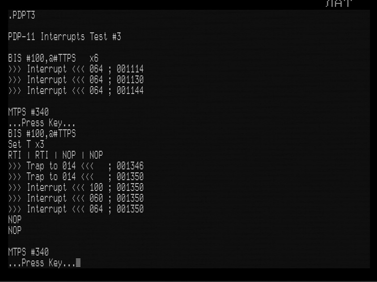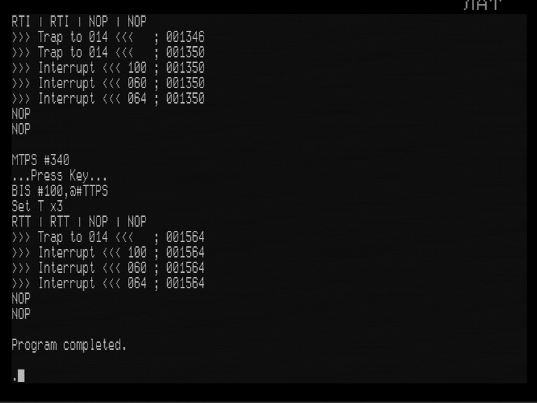 Код:.RU PDPT3 PDP-11 Interrupts Test #3 BIS #100,@#TTPS x6 >>> Interrupt <<< 064 ; 001114 >>> Interrupt <<< 064 ; 001130 >>> Interrupt <<< 064 ; 001144 MTPS #340 ...Press Key... BIS #100,@#TTPS Set T x3 RTI | RTI | NOP | NOP >>> Trap to 014 <<< ; 001346 >>> Interrupt <<< 100 ; 001346 >>> Trap to 014 <<< ; 001346 >>> Interrupt <<< 060 ; 001346 >>> Trap to 014 <<< ; 001346 >>> Interrupt <<< 064 ; 001346 NOP NOP MTPS #340 ...Press Key... BIS #100,@#TTPS Set T x3 RTT | RTT | NOP | NOP >>> Interrupt <<< 100 ; 001562 >>> Trap to 014 <<< ; 001562 >>> Interrupt <<< 060 ; 001562 >>> Trap to 014 <<< ; 001562 >>> Interrupt <<< 064 ; 001562 >>> Trap to 014 <<< ; 001562 NOP NOP Program completed. .D 10000=5037,177546,137,1000 .ST 10000 PDP-11 Interrupts Test #3 BIS #100,@#TTPS x6 >>> Interrupt <<< 064 ; 001114 >>> Interrupt <<< 064 ; 001130 >>> Interrupt <<< 064 ; 001144 MTPS #340 ...Press Key... BIS #100,@#TTPS Set T x3 RTI | RTI | NOP | NOP >>> Trap to 014 <<< ; 001346 >>> Interrupt <<< 060 ; 001346 >>> Trap to 014 <<< ; 001346 >>> Interrupt <<< 064 ; 001346 >>> Trap to 014 <<< ; 001346 NOP NOP MTPS #340 ...Press Key... BIS #100,@#TTPS Set T x3 RTT | RTT | NOP | NOP >>> Interrupt <<< 060 ; 001562 >>> Trap to 014 <<< ; 001562 >>> Interrupt <<< 064 ; 001562 >>> Trap to 014 <<< ; 001562 NOP NOP Program completed. .