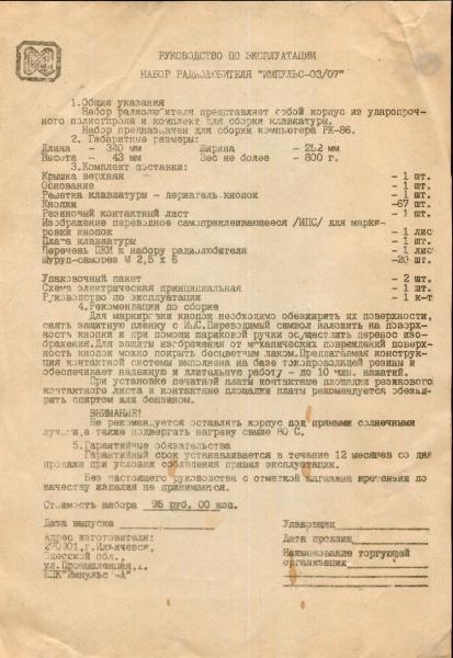 Предлагается к продаже набор радиолюбителя, "Импульс-03/07", выпускавшийся кооперативом "Импульс-А". Только набор для сборки клавиатуры без корпуса: