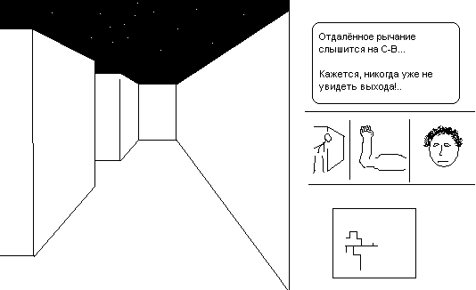 5) Последние новости (вверху справа). Здесь предупреждют о резких или критических изменениях состояния, о найденных выходе/пище. Но главное: здесь печатается то, что герой слышит (нюхает, думает). Среди не очень полезной информации здесь часто встречаются сведения о расстоянии и направлении на минотавра. Также этим указаниям можно придать характер ("рычание" -- разъяренный зверь с высокой моралью,"урчание" -- добрый зверь семейства кошачьих, "сопение" -- средняя мораль, "устрашающий рёв" -- могучий противник). И, например, надписи вроде: "Кажется, слева за углом!" -- отражают предчувствие героя (не всегда верное), которое позволяет выбрать, сразу ли свернуть налево, за угол, или лучше проявить и повысить осторожность, побежав в другую сторону.