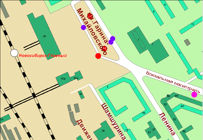• От вокзала Новосибирск-Главный: проезд автобусом 1312, троллейбус 29, маршрутка 1212 до остановки "ж/м Северо-Чемской"(это конечная). Посадка на транспорт осуществляется там где нарисована КРАСНАЯ точка. ВНИМАНИЕ!!!В связи с реконструкцией площади Гарина-Михайловского посадка на транспорт может осуществляться там, где нарисована МАЛИНОВАЯточка.